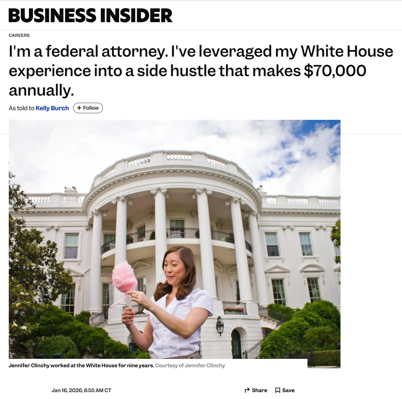 Jennifer served the President of the United States as a White House lawyer and hiring manager and now serves clients around the globe. She worked for the White House for nearly a decade, spanning three U.S. presidents. She has critiqued thousands of résumés and cover letters from the strongest candidates in the country.